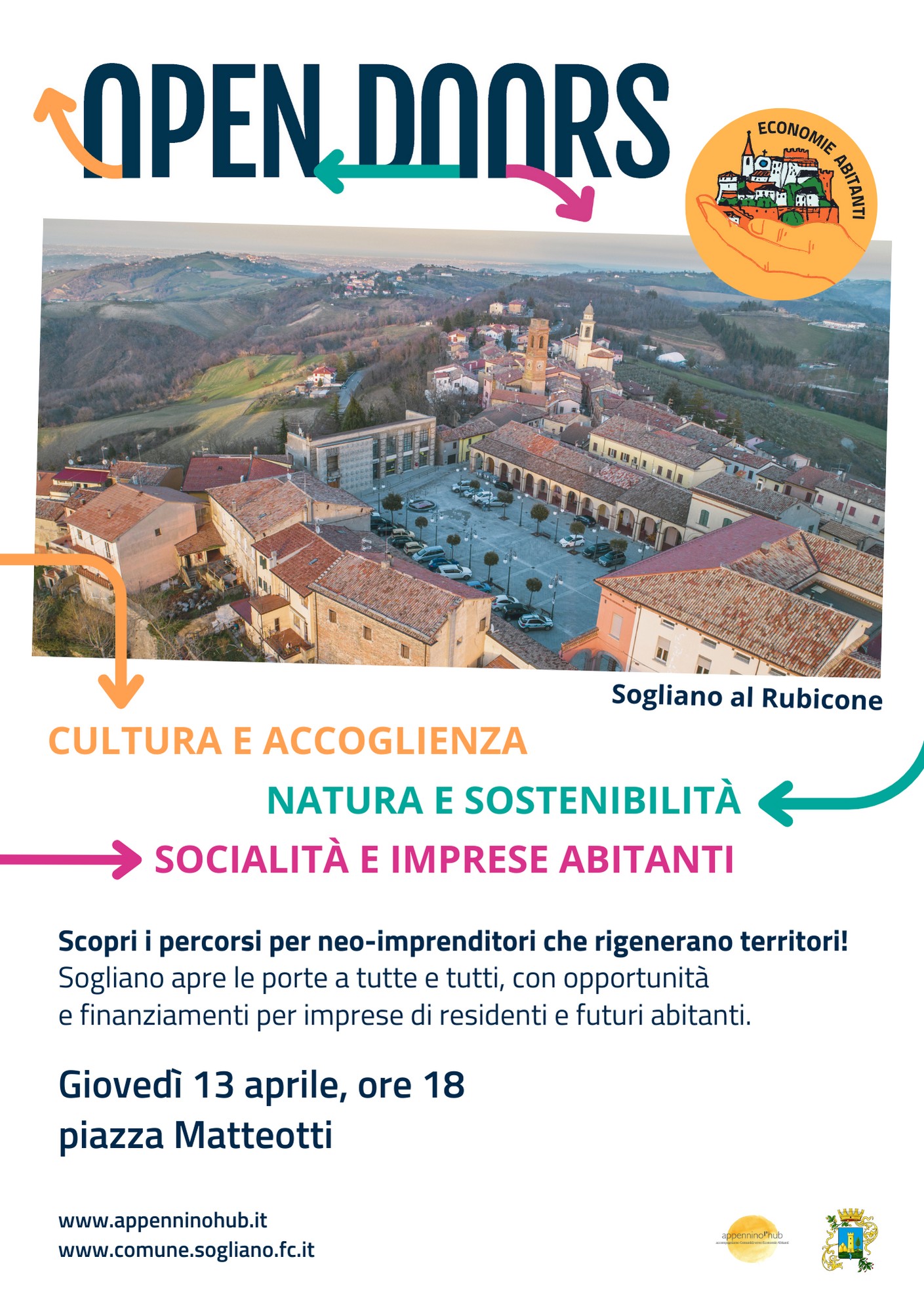 Al via il percorso di attivazione imprenditoriale dal titolo “OPEN DOORS, Nuove imprese abitanti. Percorso per neo-imprenditori che rigenerano territori”, promosso dal Comune di Sogliano al Rubicone (FC) in collaborazione con l’Associazione Figli del Mondo e l’iniziativa Appenninol'Hub.