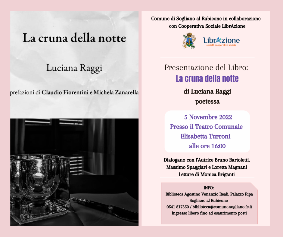 PRESENTAZIONE DEL LIBRO "LA CRUNA NELLA NOTTE" DI LUCIANA RAGGI POETESSA mercoledì 26 ottobre 2022 scarica il documento - formato png - 313 Kb