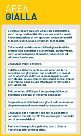 - in zona gialla aperti bar e ristoranti dalle ore 5:00 alle 18:00; max 4 persone per tavolo, salvo conviventi;